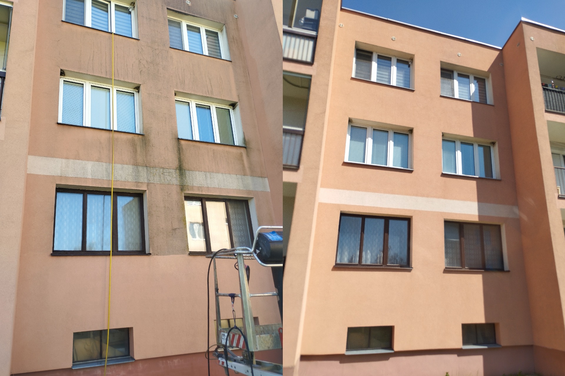 Mytí fasád za pomoci chemie a nízkého tlaku vody.