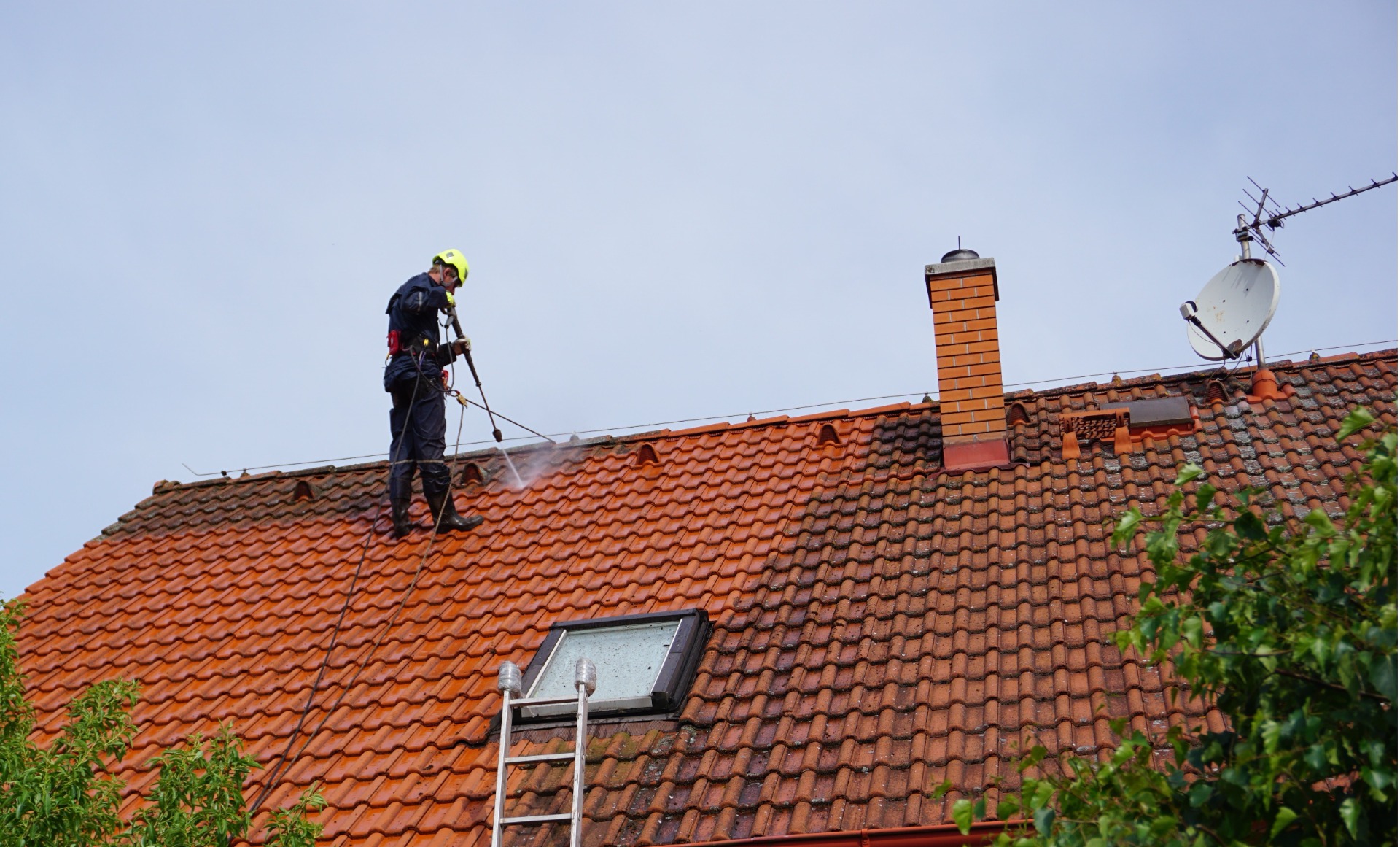 Tlakové čištění střech, fasád a venkovních povrchů benzinovým vysokotlakým čističem s tlakem 220 barů.